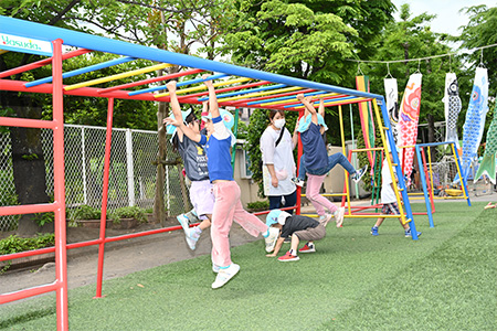 異年齢のお友だちや障がいのあるお友だち、地域親子やお年寄りとの関わりを通して、思いやりの心を育みます。