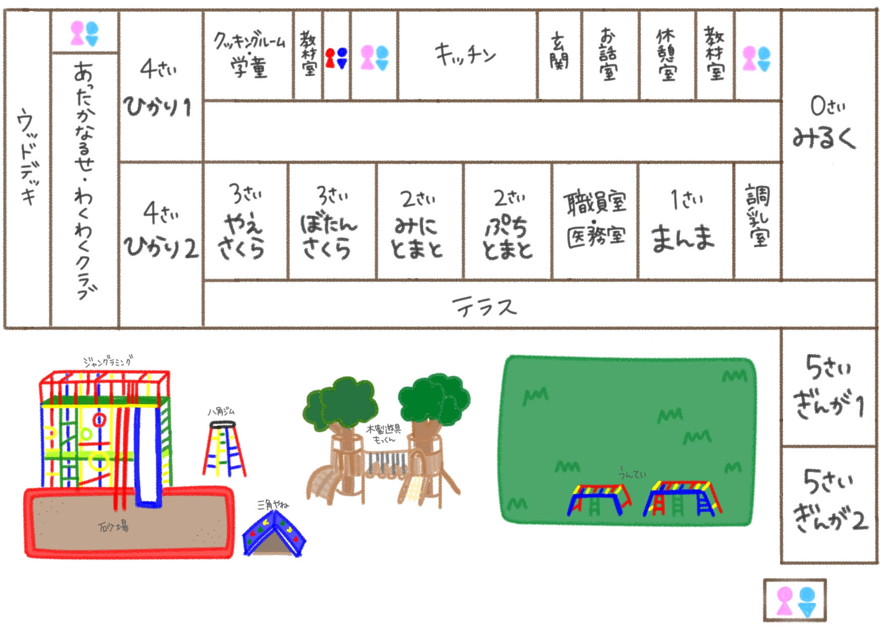 | 設備規模 | ●町田わかくさ保育園 敷地面積 約2,415平米 建物面積 約1,008平米 ●町田わかくさ分園 延床面積 約215.68平米 |